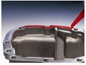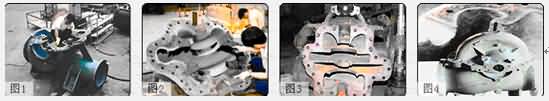 圖1: 渣漿泵泵腔在高速液體中的砂粒的沖刷作用下,磨損嚴(yán)重,圖為打磨泵體磨損面后,用RJ系列特種耐磨材料進(jìn)行修復(fù)。