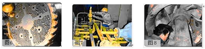 圖6: 冷凝器端板腐蝕修復(fù):由于水垢造成大面積銹蝕、堵塞、破損。圖為使用耐腐蝕涂層對(duì)其工作表面刷涂,制作保護(hù)層。脹管處出現(xiàn)腐蝕,結(jié)果導(dǎo)致內(nèi)漏,連接處由于銅管與管板為不同材料的金屬,產(chǎn)生電化學(xué)腐蝕需要修復(fù)。采用高效清洗劑+耐腐蝕涂層完全根治了泄漏,用高效清洗劑去除污物,耐磨膠粘劑與金屬高粘接強(qiáng)度防止腐蝕的進(jìn)一步惡化,并完全杜絕了腐蝕的再次發(fā)生。