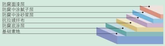 面涂層 | 5、使用防腐環(huán)氧面漆,用準(zhǔn)備好的滾筒浸上面漆,均勻滾涂,要求涂層均勻,無漏涂,滾涂2遍,或噴涂1-2遍 | 0.25-0.30kg/m2 |